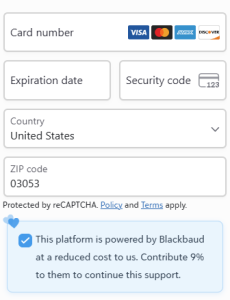 Please note: any optional amount contributed to Blackbaud is not tax-deductible, as it goes directly to them, not to our organization.
