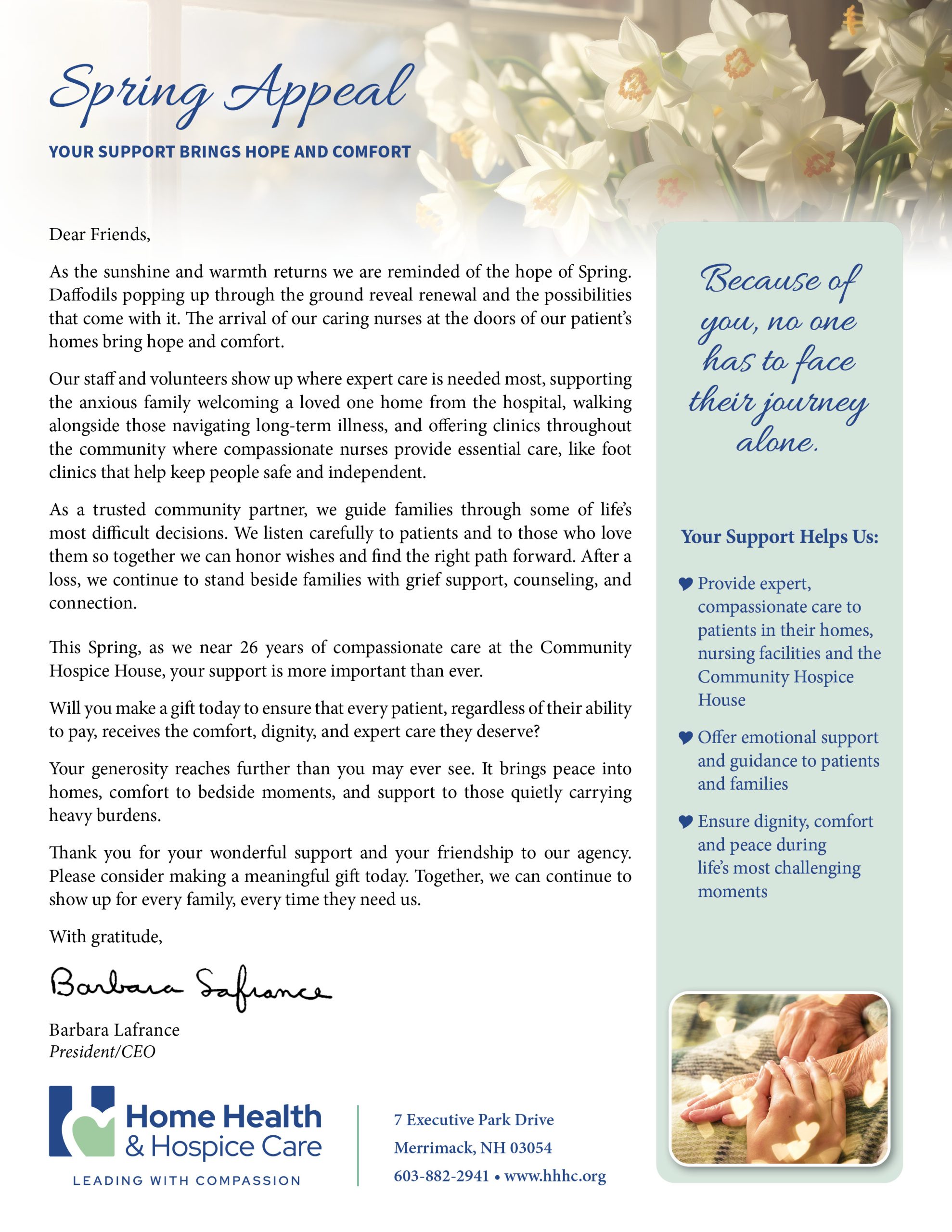 Your Spring Appeal gift helps Home Health & Hospice Care continue providing expert home health services, hospice support, and the compassionate care of the Community Hospice House to patients and families when they need it most.